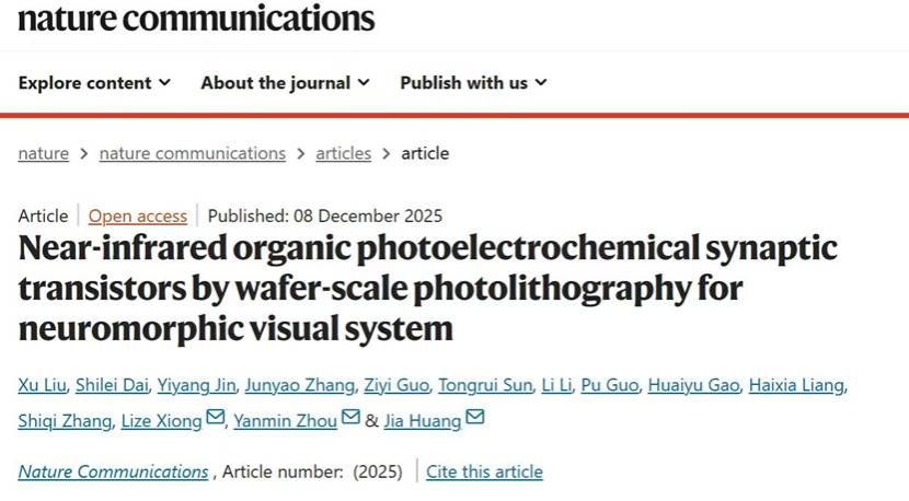 近日,我院黄佳教授团队在有机晶体管感知器件领域取得进展。12月8日,《自然•通讯》(Nature Communications)在线发表了该团队的一篇研究论文,题为“Near-infrared organic photoelectrochemical synaptic transistors by wafer-scale photolithography for neuromorphic visual system”。光电突触器件在推动类脑人工智能和类视觉系统发展中发挥着关键作用。近年来,基于有机场效应晶体管的光电突触器件备受关注,但也面临...
