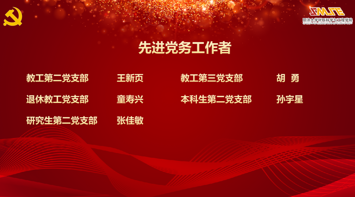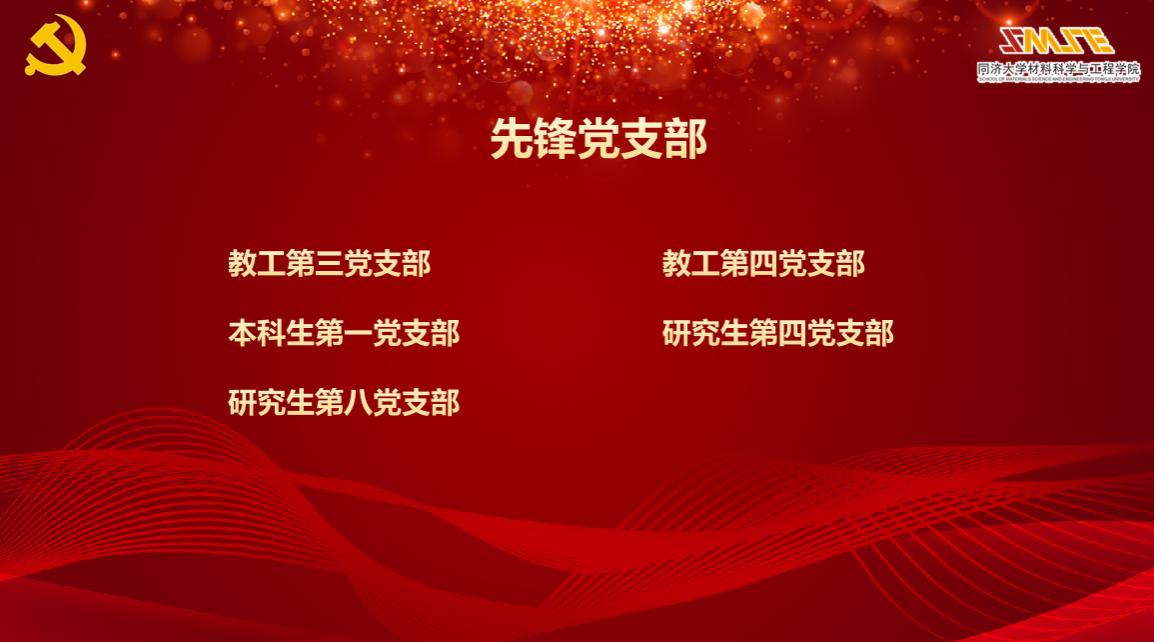 颁奖完毕后,教工第三党支部书记祖国庆、研究生第八党支部钟雪鹏、教工第四党支部陈庆,分别作为学院先锋党员、学校优秀共产党员、学院先锋党支部代表进行交流发言。代表们指出,要牢记党员初心,聚焦国家的发展战略大局,将党的建设工作融入到教育、科技、人才各项中心工作中,融入到材料强国的使命担当中。