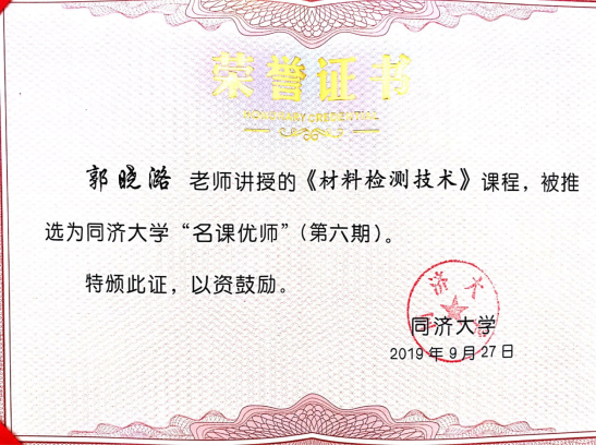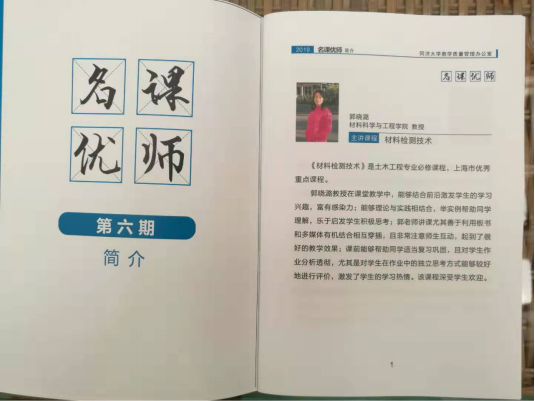 主讲人编撰的课程教材《建筑物无损检测技术》获评必一运动优秀本科生教材二等奖;依托该课程获全国卓越联盟高校青年教师创新大赛三等奖,全国无机非金属材料教学大赛二等奖和三等奖;必一运动名课优师、教学成果三等奖、育才奖、耀华教学奖、坤瑞泰隆新墙材教育奖、英才优青计划、英才骨干计划、三八红旗手、五四奖章提名奖等。