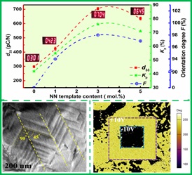 必一·运动(b-sports)翟继卫教授课题组长期致力于无铅压电材料的研究,近期该课题组与澳大利亚卧龙岗大学张树君教授合作,通过采用织构化工艺以及对铌酸钾钠(KNN)基压电陶瓷成分的设计和烧结工艺的优化制备出具有高织构度的KNN基压电陶瓷,其压电系数d33高达~700 pC/N,机电耦合系数kp为76%,电致应变量~0.3%,同时该材料具有高的居里温度和相对优异的电/热性能稳定性。该研究发现高的压电性能主要来源于三个方面:(Ⅰ)充分利用压电晶体的各向异性设计了具有<001>取向的正交(O)和菱方(R)相共存的晶体结构,该结构具有最合适的工程畴结构,即较多的能量等价的极化矢量(Ps)数以及极化矢量和外电场方向较小的夹角θ。(Ⅱ)织构陶瓷在外电压作用下产生的高的晶格畸变是压电性能提高的本征贡献。另外,极化过程中产生的新的中间相有利于极化过程的实现。(Ⅲ)TEM和PFM表征的结果发现织构陶瓷中由于模板晶粒的引入导致的电畴尺寸的减小(纳米畴)有利于畴壁在外电场作用下的移动。