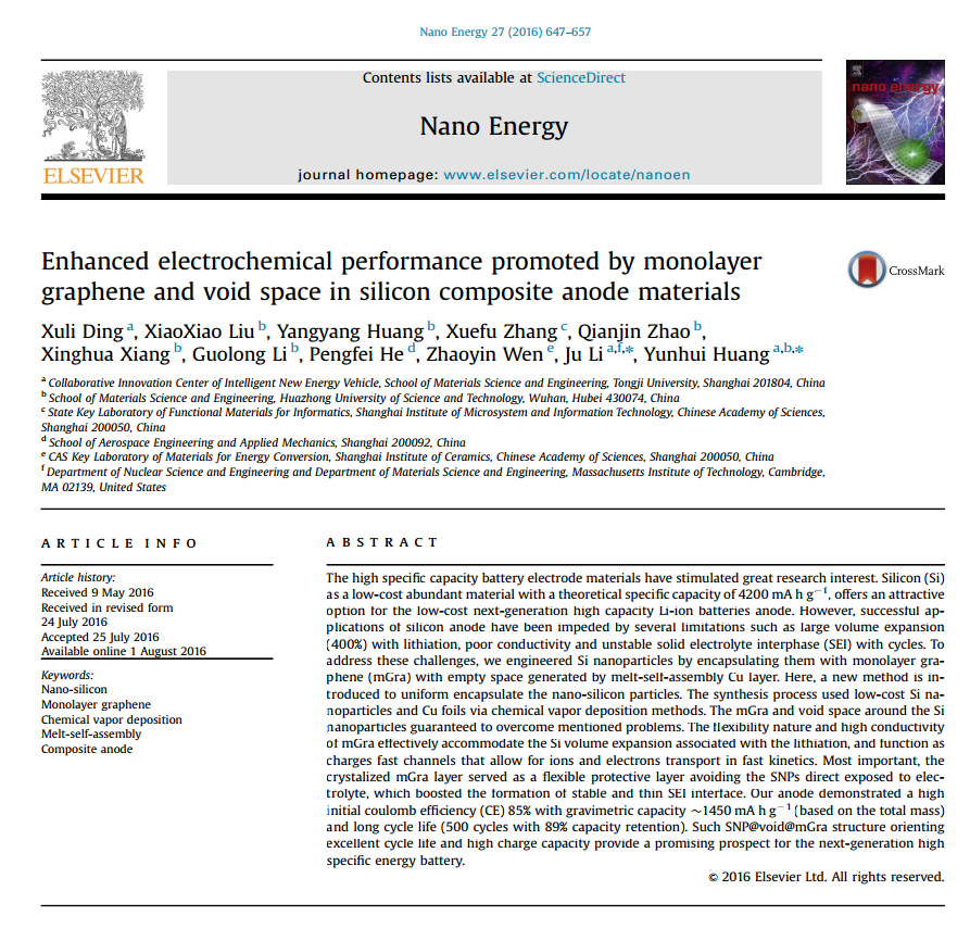 近日,我院研究团队在纳米能源领域顶尖期刊《Nano Energy》(IF=11.55)上发表了题为《Enhanced Electrochemical performance promoted by monolayer graphene and void space in silicon composite anode materials》的文章。该论文的第一作者为该团队丁旭丽副研究员,通讯作者为黄云辉教授,必一·运动(b-sports)为论文的第一作者单位。