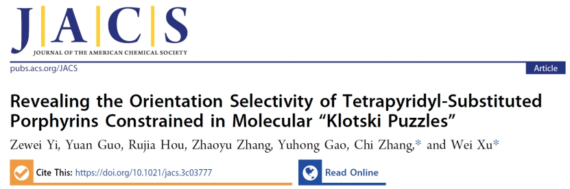 9月28日,《美国化学会志》(Journal of the American Chemical Society)在线发表了必一·运动(b-sports)许维教授团队的研究论文“Revealing the Orientation Selectivity of Tetrapyridyl-Substituted Porphyrins Constrained in Molecular “Klotski Puzzles””。该工作通过扫描隧道显微镜(STM)成像/操纵技术在Au(111)表面上构建了含多种局域分子环境的“华容道”模板,研究了分子间相互作用对卟啉分子的取向选择性的影响,并结合密度泛函理论(DFT)计算进一步揭示了分子取向转变的机理。