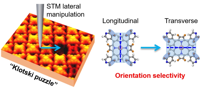 有机分子在自组装结构中的取向直接影响有机材料的性能。因此,在单分子尺度上精确识别和控制有机分子的取向对于理解自组装机理并发展先进有机功能材料具有重要意义。传统的谱学方法可以区分平行或垂直于薄膜平面的分子取向,并实现分子平均取向的监测,但是无法表征单个分子的具体取向。在此方面,扫描探针显微镜(SPM)则提供了一种在单分子尺度上表征有机分子在表面上具体取向的强大手段。另外,SPM操纵技术能够可控地诱导孤立分子在表面的运动,从而精准控制该分子的取向。然而,到目前为止,在组装结构中的分子取向选择性仍未可知。因此,通过构建不同的分子环境来研究分子间相互作用对于有机分子取向选择性的影响是非常重要的,可以进一步推动功能化的有机纳米器件的发展。许维教授课题组利用STM横向操纵技术构建了含多种局域分子环境的“华容道”模板,研究了分子间相互作用对卟啉分子的取向选择性的影响,并结合DFT计算揭示了分子取向转变的机理。该研究在单分子尺度上展示了自组装结构中分子间相互作用与分子取向的精妙关联,提供了有机材料中分子取向选择性的基础理解,进一步有利于发展先进有机功能材料。