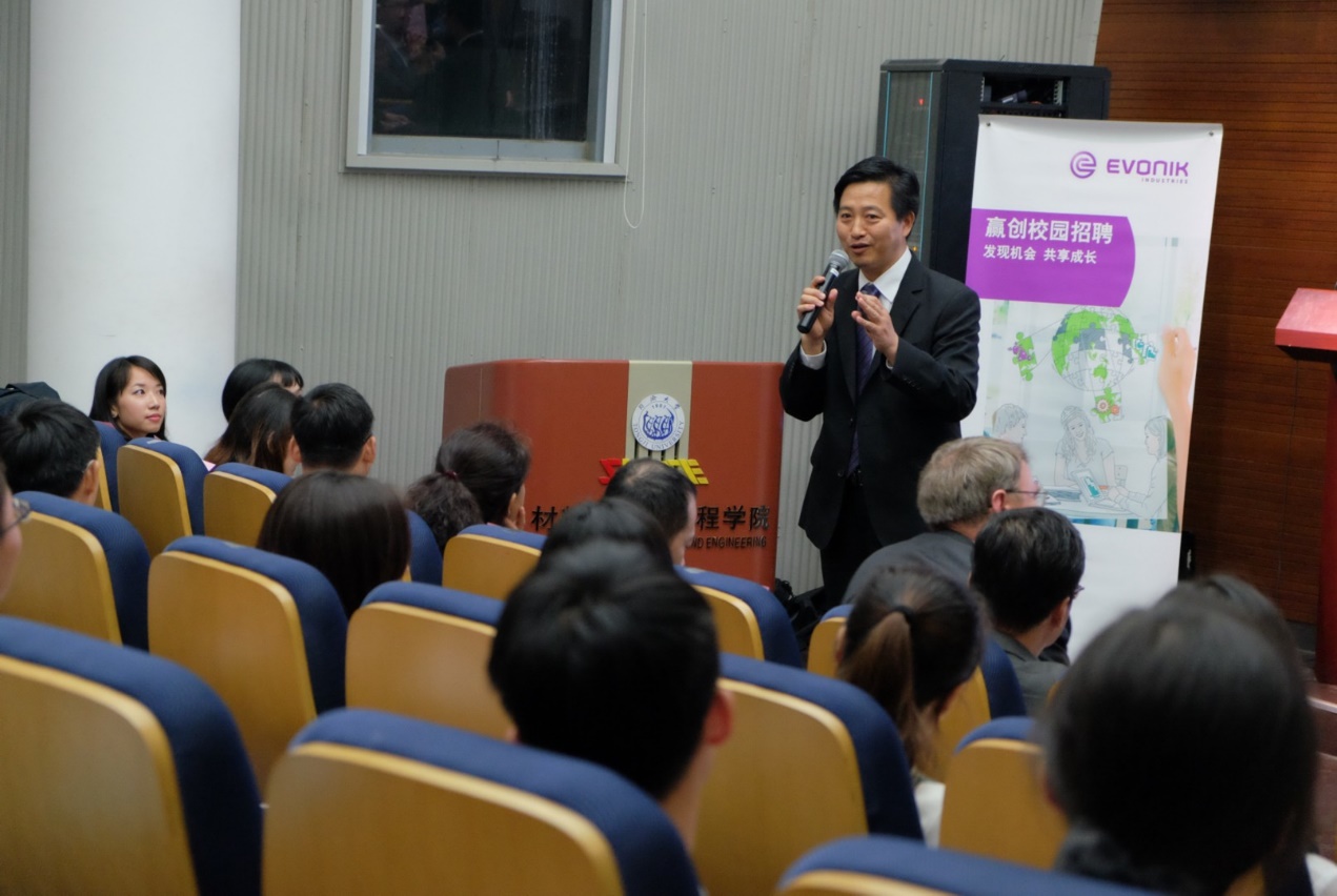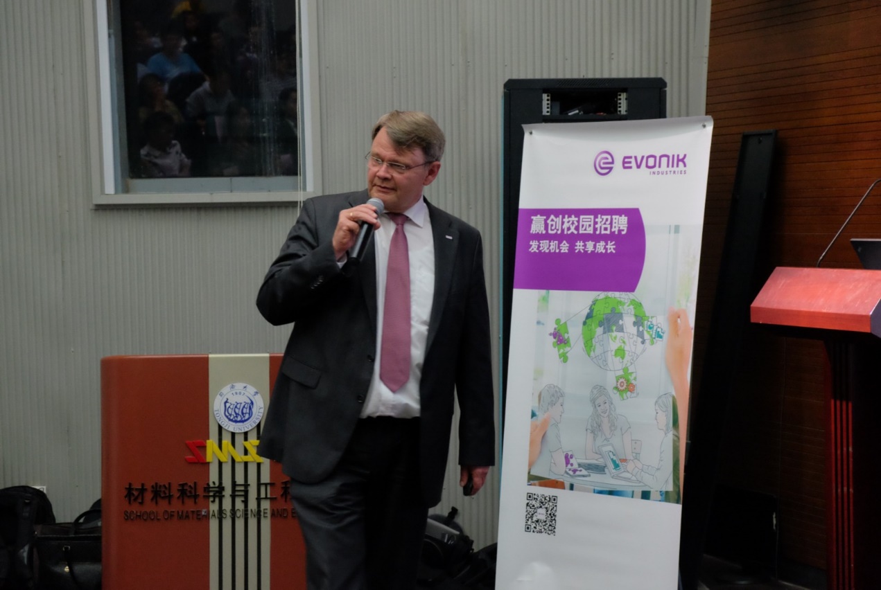 2016年10月17日晚,赢创2017同济首场招聘会在必一运动嘉定校区材料学院德才馆顺利举行。赢创大中华区总裁柯乐施(Dr Claas Klasen)博士、赢创特种化学(上海)有限公司总经理陈金秋博士、赢创德固赛(中国)投资有限公司人力资源总监程大年、赢创特种化学(上海)有限公司业务项目经理陆芳(同济校友)等做客宣讲会,学院副院长邱军、党委副书记王凌凌出席。来自同济、交大等高校的各专业的2017届本、硕学生约100人与会。