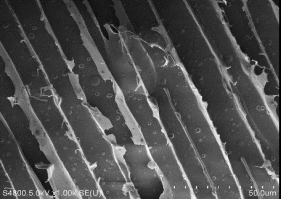 由于水泥基材料为不导电样品,同时为了观察其在均匀外力作用下自然断裂面的微观形貌,本图片为直径约1cm不进行任何处理的小试块进行微观形貌观察的结果。由于样品的不导电性以及表面形状的凹凸不平,给电镜拍摄带来相当大的难度。拍摄图像所采用条件:真空度:1.97e-004pa;电压:5KV;工作距离:3.0mm;放大倍数10K;所采集的信号为二次电子。拍摄图像如同一束生长在悬崖边的杂草。其实则为钙矾石。其能够导致水泥基材料性能的弱化和损失,也是水泥基构件在外力作用下,容易发生破坏的受力薄弱点。