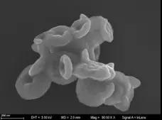 本图为实验过程中研究不同反应温度时间下Fe2O3纳米环的生长情况的SEM图片,图中可以观察到Fe2O3纳米环在220℃,反应时间为48小时条件下自组装得到的类似于摩托车赛手的形貌。