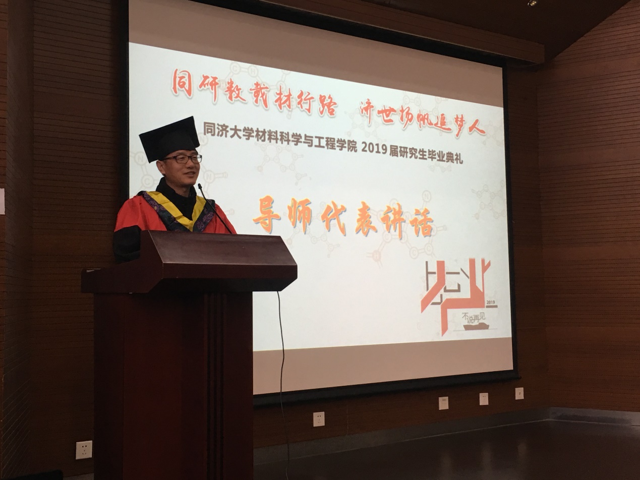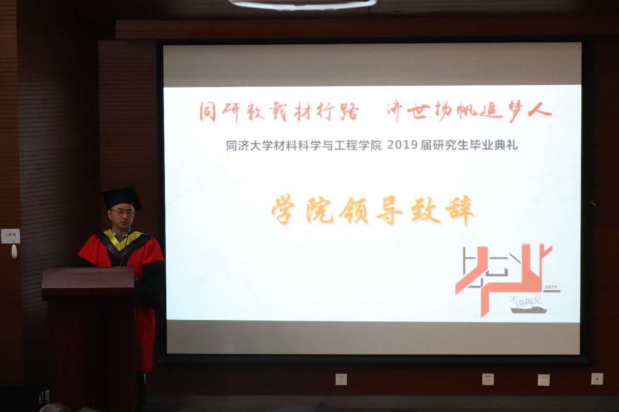 典礼在雄壮的国歌声中拉开序幕,典礼伊始,学院学科委员会主任黄云辉致辞,他对全体毕业研究生致以最美好的祝福,有感于同学们数年年坚持的不懈努力,欣慰于同学们终于成长为于国于家有望的人,黄老师同时也向提出了几点希冀,希望毕业生能够牢记知行合一的行事宗旨,在未来的工作生活中真正的践行“仰望星空,脚踏实地”的信念,并牢记必一运动“同心同德同舟楫,济世济人济天下”的校训,做一个团结友爱,同心同德,富有教养的人。最后,黄云辉嘱托毕业学子,一定要秉承着“穷则独善其身,达则兼济天下”的伟大梦想,为中华民族的伟大复兴贡献出自己的力量。