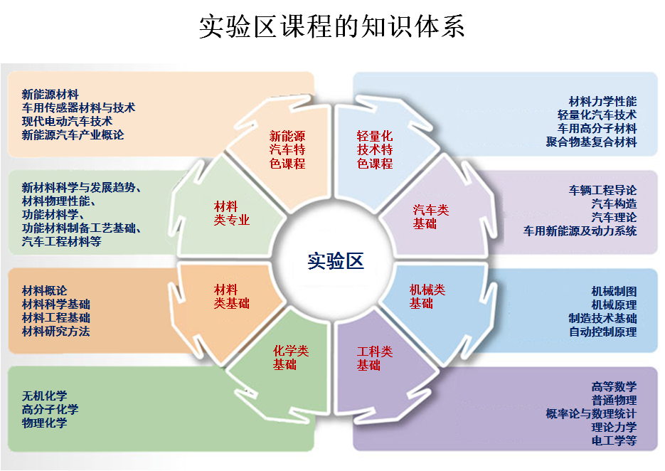 实验区学生同时开展车辆工程相关专业基础课程学习,并通过材料-汽车学科交叉课程的学习,以满足未来汽车工程相关领域工作和学习深造的要求,并实现学科融合交叉的人才培养需要。