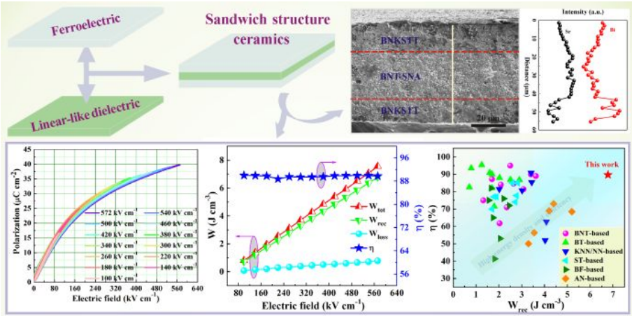 综上所述,作者在此通过A位缺陷工程、组成设计策略和宏观三明治结构调控策略对环境友好型的BNT基无铅铁电体陶瓷的能量存储性能进行详细的研究,使得无铅陶瓷的储能密度和储能效率得到大幅度的提升,为后续无铅储能陶瓷介质的研究工作具有重要的借鉴和指导作用。