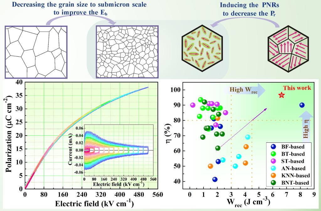 图2. 通过诱导PNRs降低剩余极化强度与减小晶粒尺寸提高击穿电场强度获得优异储能性能