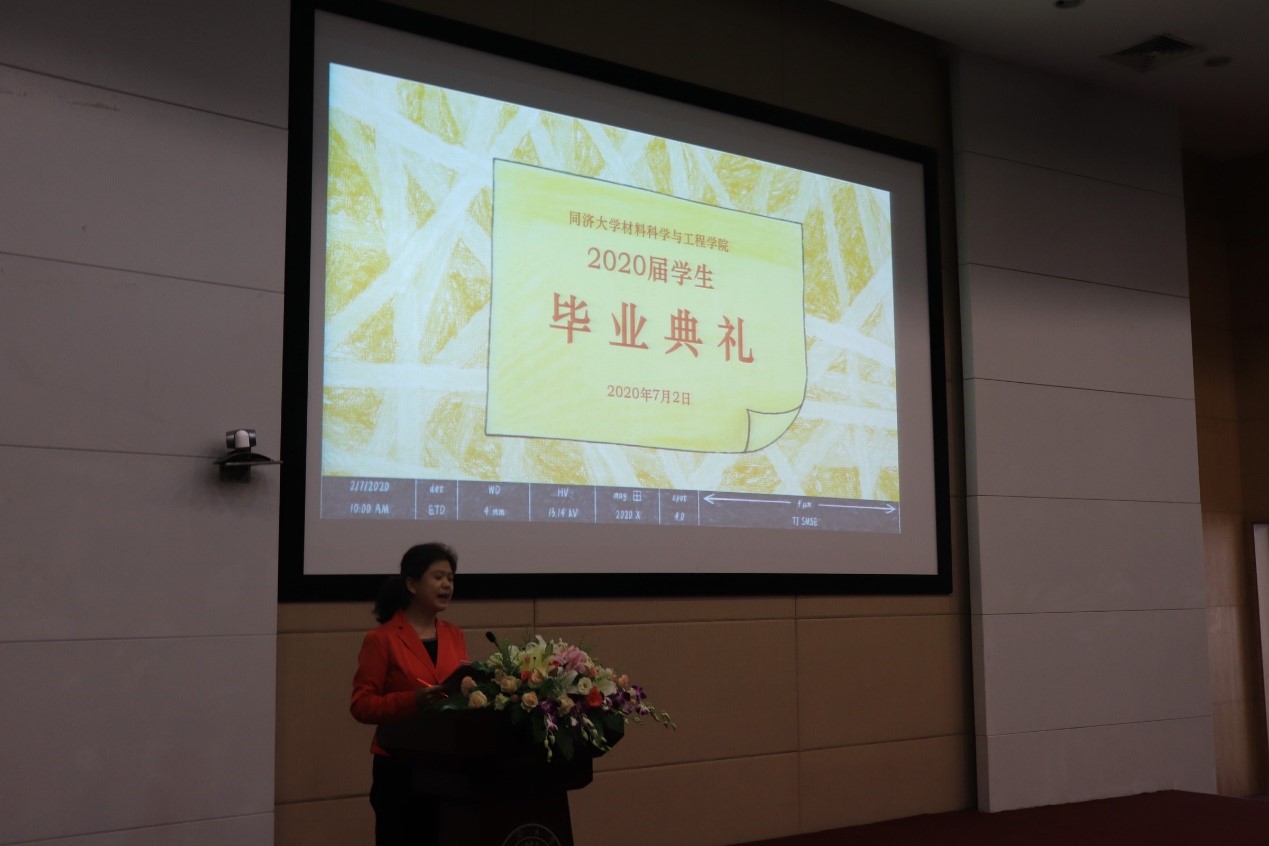 2020年上海市优秀毕业研究生丁元琪博士和上海市本科优秀毕业生何然同学分别代表全体研究生及本科毕业生发言。丁元琪博士回顾了与同济相伴的九个年头,见证了自身在导师的悉心引导以及学院的良好平台下,从一个对科研毫无概念的本科生逐渐成长为可以涉足学术领域的博士的过程。她强调,得到博士学位远远不是终点,但它意味着我们拥有了扎实的功底以及独立思考的能力,这将成为我们未来闯荡世界,遭遇挫折以及追逐梦想时的强大底气。何然同学以点滴细节带大家重温初入校园的心境,第一次在校园迷路,第一次夜晚辗转反侧,第一次品尝的食堂饭菜,第一节学习的课程,当初的热血澎湃仿佛就在昨天。临别降至,他希望同学们无论是奔赴工作岗位或是求学深造,均能牢记“同心同德同舟楫,济人济事济天下”的同济精神,乘风破浪,勇敢奔赴理想,永远年轻,永远热泪盈眶。