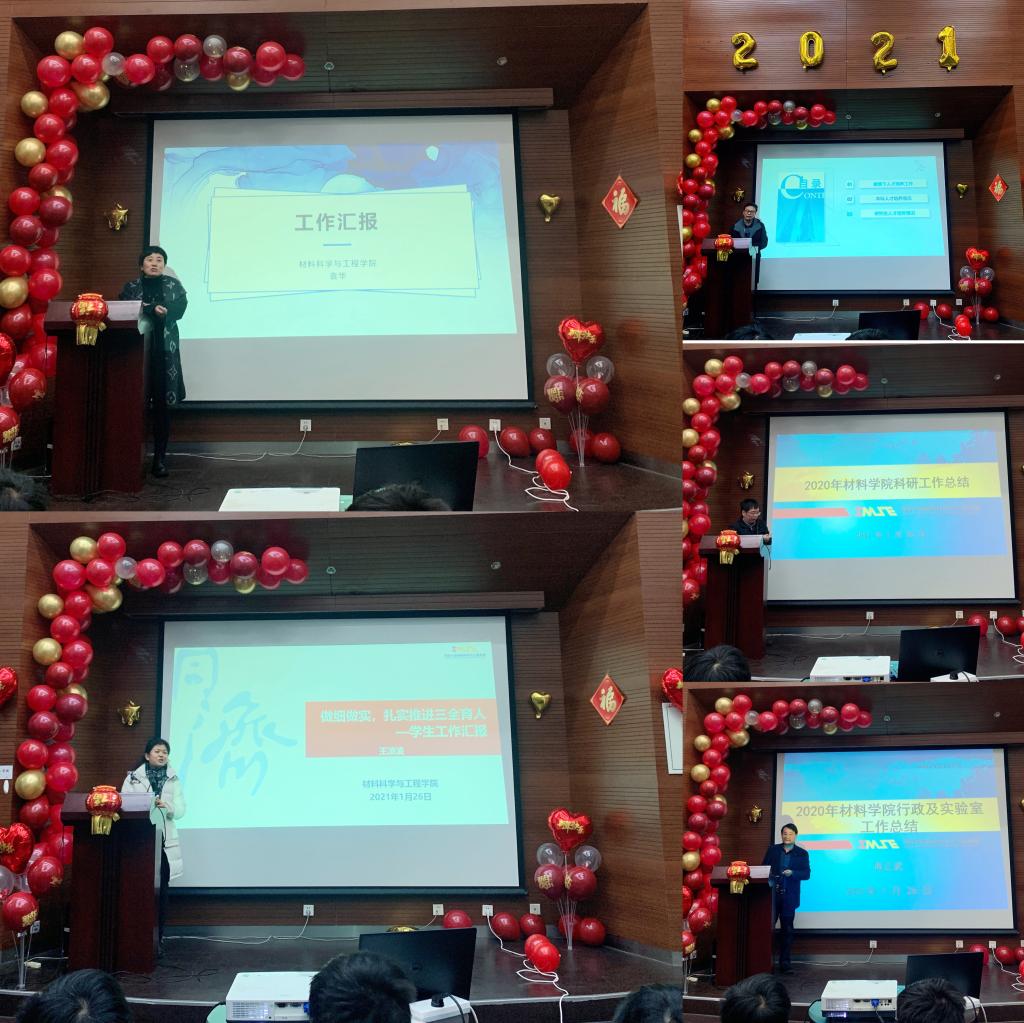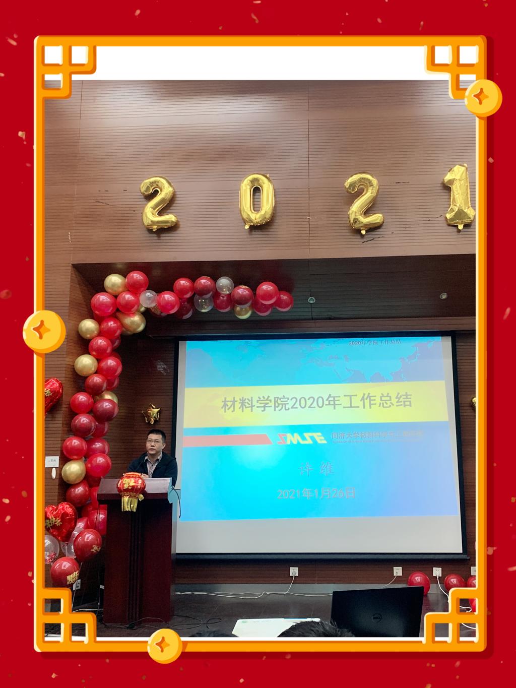 院长许维作了材料学院2020年工作总结报告,总结了2020年学院的工作亮点、指出存在的差距和不足、制定了2021工作目标以及主要任务举措。报告指出:2020年是极不平凡的一年,面对突如其来的新冠肺炎疫情,全体教职工凝心聚力,在疫情大考中,交出了合格答卷。杨正宏教授更是荣获上海市抗击新冠肺炎疫情先进个人和必一运动追求卓越服务奖。这一年,立德树人成效进一步提升,国家高层次人才计划取得突破性进展,基础研究成果取得持续性进展,科研能力水平取得阶梯性提升,本科专业建设取得显著性成效,材料学科国际影响力稳步提升。学科的每一点进步,都离不开广大教职员工的不懈努力和辛勤付出!一年以来,学院取得的成绩让人鼓舞,但与推进中国特色世界一流大学和一流学科的建设目标相比还存在不少差距。通过第五轮学科评估,总结前五年,通过系统的“体检”寻找差距。2021年的工作目标,总体思路:继续深化“两轮驱动,人才引领”战略方针,围绕立德树人、科学研究、学科建设等中心工作形成趋同的学术价值观。同时指出2021年具体的任务举措和重点专项工作。许院长表示希望大家在2021年继续不忘初心,砥砺前行,为学院取得更好的成绩努力奋斗。