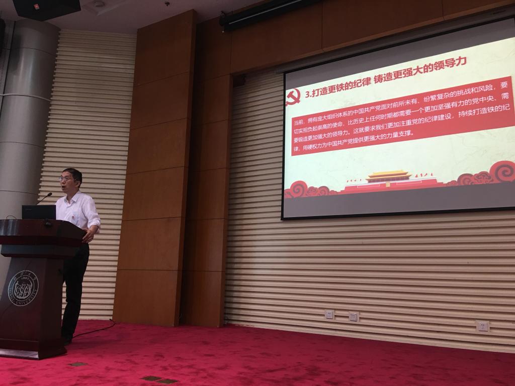 袁华副书记的党课分三个部分。第一部分讲述了铁的纪律是中国共产党坚强领导力的鲜明特质。具体介绍了中国共产党建党初期、新民主主义革命时期以及新中国成立后党的不同时期的纪律建设,强调无产阶级政党的纪律与其他政党的纪律不同,无产阶级政党的纪律是铁的。袁华指出,在百年奋斗历程中,中国共产党始终强调铁一般的刚性的纪律约束,保证全党意志统一、行动统一、步调一致,形成坚强无比的领导力,确保党的事业从胜利走向胜利。面对世界百年未有之大变局和实现中华民族伟大复兴战略全局,中国共产党要有效应对前所未有的各种挑战、化解各种风险、推进中国特色社会主义事业,必须进一步加强党的纪律建设,使党的领导更加坚强有力。第二部分讲述了严明纪律是中国共产党坚强领导力的强大支撑。重点介绍了党的六大纪律:政治纪律、组织纪律、廉洁纪律、群众纪律、工作纪律、生活纪律内容与基本要求,同时列举了违反六种纪律行为表现。袁华指出,严明政治纪律,增强党的统领力;严明组织纪律,强化党的组织力;严明廉洁纪律,提升党的公信力;严明群众纪律,激发党的号召力;严明工作纪律,塑造党的优良作风;严明生活纪律,增强党的人格力量。第三部分讲述了打造更铁的纪律 铸造更强大的领导力。袁华指出,拥有庞大组织体系的中国共产党面对前所未有、纷繁复杂的挑战和风险,要切实担负起崇高的使命,比历史上任何时期都需要一个更加坚强有力的党中央、需要锻造更加强大的领导力。纪律是自由的第一条件,要求全体党员和积极分子增强“四个意识”、坚定“四个自信”、做到“两个维护”,自觉在思想上政治上行动上同党中央保持高度一致,自觉维护党的团结统一,严守党的政治纪律和政治规矩,始终保持同人民的血肉联系。注重党纪党规学习,提高政治站位,自觉维护党纪党规最后,袁华说,中共十八大以来,以习近平为总书记的新一届中央领导集体,大力推进国家治理体系和治理能力现代化建设,制定、修订了一系列党纪党规和监督执纪办法,规范了监督执纪工作流程,同时实行了中央巡视全覆盖,进行了纪检、监察机构的改革,实现了党纪与国法的有效衔接,用铁的纪律铸造中国共产党一定能带领全中国从一个胜利走向另外一个胜利。