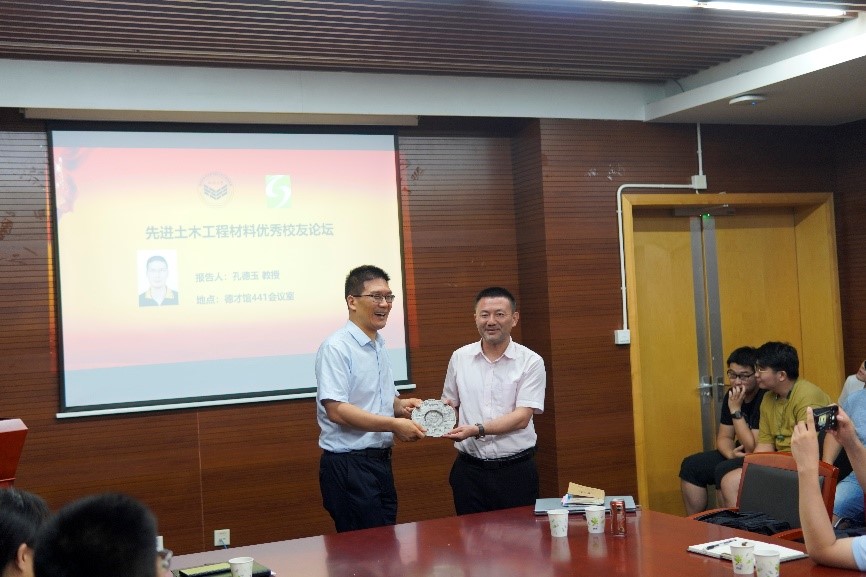 活动开始,孙振平老师致辞并隆重介绍了上海台界化工有限公司及到场的各位嘉宾、着重介绍了必一运动优秀校友---浙江工业大学的孔德玉教授,并邀请孔教授作名为“基于固相水化理论的水泥基材料缓凝机理——以蔗糖与氢氧化锌为例”的学术讲座(图1)。孔教授在系统分析水泥水化机制的基础上,深入浅出地阐释蔗糖与氢氧化锌等化合物对水化进程的影响,获得了在场师生的高度关注和积极点评。为答谢孔教授多年来对材料学院的持续关注和支持,报告结束后,孙振平老师代表学院及系赠上纪念品(图2)。随后,在激情澎湃的颁奖音乐声中,颁奖仪式拉开序幕,孙振平老师、孔德玉教授、张国防老师、吴凯老师、徐玲琳老师和卢子臣老师等嘉宾为获奖同学颁奖并合影留念。