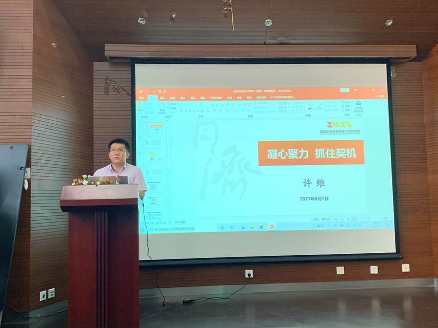 许维院长以“凝心聚力 抓住契机”为题,从“学校对材料学院和学科建设的决心”、“材料学科自身发展的潜力与推动力”和“材料交叉科学研究中心及平台建设”三个方面对学院当前发展现状进行分析。指出大家要上下一心,通力协作,共谋发展。