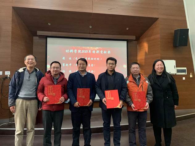 随后的表彰环节学院对2021年度获得国家级荣誉、上海市级奖励、校级奖励、年度优秀教师进行表彰,同时原党委书记王中平老师对获得材料学院2021年度特别贡献奖的老师颁发了荣誉证书。