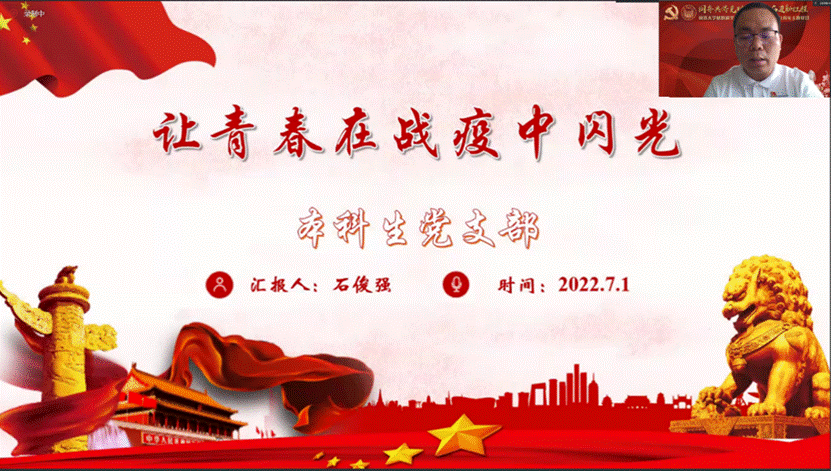 “同舟共济克时艰,聚力奋进新征程”庆祝建党101周年主题党日在庄严的中华人民共和国国歌声中拉开序幕。首先,来自学院教工和学生党支部的8位代表围绕四个主题八个板块分享了自己的战“疫”故事。