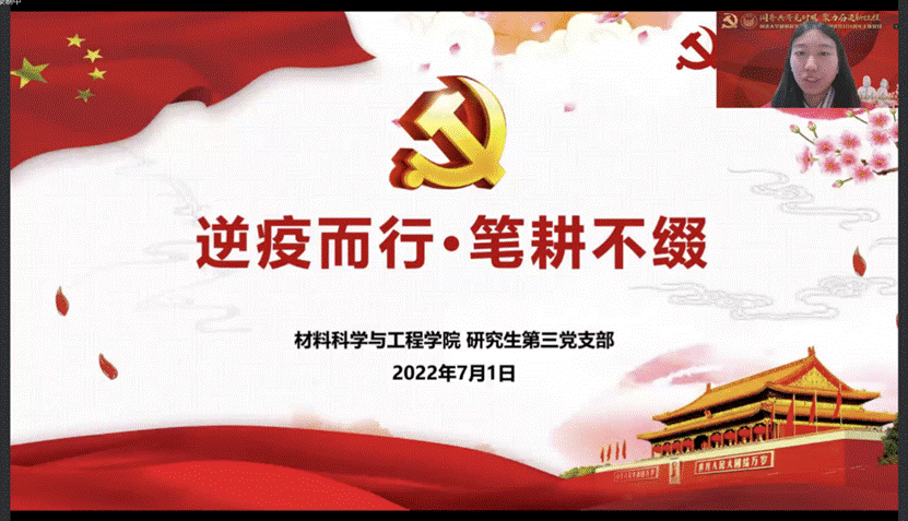 研究生第三党支部书记倪菲儿就抗击疫情期间学生的科研进展,向与会同志做了主题为“逆疫而行,笔耕不辍”的分享,为大家简要介绍了学院本学期开设的“学术达人开讲啦”主题论坛的六期主要内容。同时,她还展示了部分学院师生在疫情防控期间发表的论文成果。她表示:在疫情防控期间,材料学子在在导师的引导下不忘科研,笔耕不辍,努力创新研究成果,在逆境中迎难而上,勇攀科研高峰,展现了材料人内心坚定的学术追求。