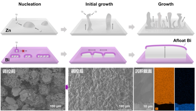 针对水系锌电中存在的问题,必一运动傅婧教授课题组发现了一种在锌负极中使用铋作为固相表面活性剂调控锌在高容量条件下实现动态可持续调控锌沉积-溶解过程的策略。铋的低表面能和松散原子堆积提供了其作为良好固相表面活性剂的热力学和动力学起源,并且铋良好的导电性确保了即使在有锌覆盖情况下的快速电荷转移。通过利用铋的独特特性,该研究解决了锌电池技术中的关键问题,铋作为固相表面活性剂可以在锌沉积的过程中持续上浮,在沉积过程中铋限制了锌原子的横向迁移,以更小的核形成过电位促进了局部形核,致密且更各向同性的锌生长阻止其形成大的枝晶,也确保随后的更彻底的剥离,从而显著提升了锌基电池的电化学稳定性和库仑效率,对电池的长期使用和安全性至关重要。这项进展突显了锌基电池作为可持续替代方案的潜力,强调了其在能源效率和环境可持续性方面的优势。