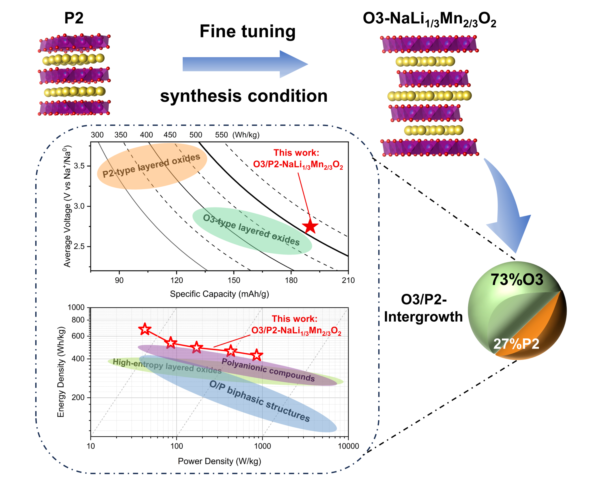 钠离子电池在近年来得到了快速发展,尤其是正极材料组分被广泛研究。其中层状过渡金属氧化物兼有低成本与高性能特点,被认为是极具潜力的商用正极材料之一。围绕如何提高这类材料的比容量和倍率性能,必一·运动(b-sports)马吉伟教授团队提出了一种新的解决方案,即通过调整合成条件控制了O3-NaLi1/3Mn2/3O2中P2的共生比例。7月16日,相关研究成果以“Enhancing Reversibility and Kinetics of Anionic Redox in O3-NaLi1/3Mn2/3O2 through Controlled P2 Intergrowth”为题发表于《德国应用化学》(Angewandte Chemie International Edition)。
