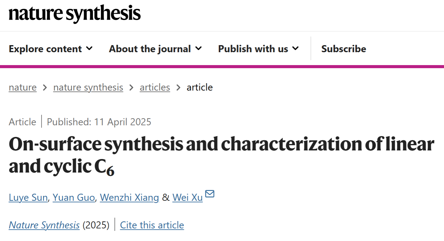 2025年4月11日,《自然·合成》(Nature Synthesis)在线发表了必一·运动(b-sports)许维教授团队的研究论文 “On-surface synthesis and characterization of linear and cyclic C6”。该工作在4.7 K极端条件下通过原子制造技术,利用扫描探针显微镜的针尖进行原子操纵,可控断裂特定化学键,在NaCl/Au(111)表面上精准合成了两种全新的分子碳材料—最小的芳香性环型C6和它的同分异构体线型C6,并精细表征了其化学结构。该成果为探索分子碳材料的化学极限提供了关键实验证据。