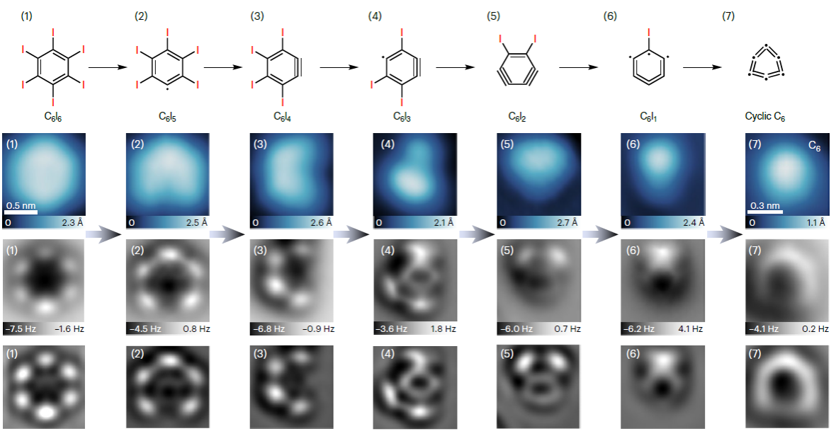 研究团队创新性地采用全卤代苯(C6I6)作为前体分子,在液氦冷却的4.7 K超低温环境下,将分子"冻结"于氯化钠薄膜表面。利用扫描隧道显微镜针尖的原子级操控技术实现精准脱卤反应,通过调控基底耦合效应,在单层NaCl表面成功制备了线型碳C6,并在双层NaCl表面突破性地获得了环型碳C6。原子力显微镜的化学键分辨成像技术首次清晰揭示了两种同分异构体的结构特征,即线型碳C6呈现单三键交替的聚炔型,环型碳呈现连续双键的累积烯烃型。以上结果为分子碳材料基础理论研究提供了直接实验证据。