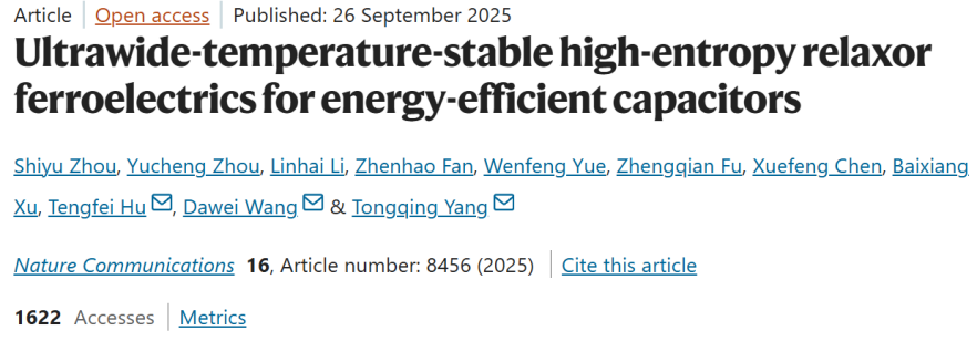 9月26日,必一·运动(b-sports)杨同青教授有关电介质储能电容器的研究成果以“Ultrawide-temperature-stable high-entropy relaxor ferroelectrics for energy-efficient capacitors”为题发表于《自然·通讯》期刊(Nature Communications)。