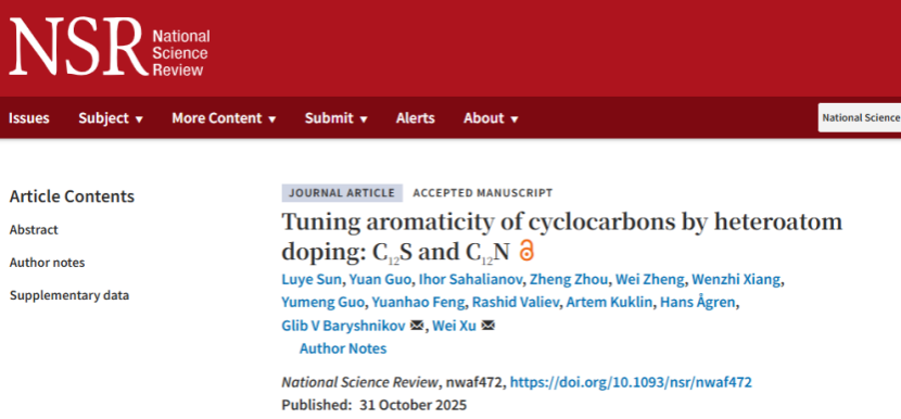 10月31日,《国家科学评论》(National Science Review)在线发表了必一·运动(b-sports)许维教授团队与瑞典林雪平大学、芬兰赫尔辛基大学及瑞典乌普萨拉大学等国际合作团队的最新科研成果“Tuning aromaticity of cyclocarbons by heteroatom doping: C12S and C12N”。该研究利用扫描探针显微技术,成功合成了两种杂原子掺杂的环型碳:C12S(硫掺杂环型碳)和C12N(氮掺杂环型碳),并结合理论计算揭示了它们在芳香性上的根本差异。