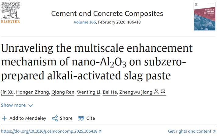碱活化矿渣浆(AASP)因其较低的冰点,展现出在寒冷地区原位负温制备的潜力,而纳米材料的引入可促进其在低温下形成致密结构,是提升负温力学性能的关键途径。团队聚焦AASP在20℃至-20℃范围内的原位制备行为与多尺度表征手段,深入揭示了纳米氧化铝(NA)在负温下的改性机制。研究成果以“Unraveling the multiscale enhancement mechanism of nano-Al2O3 on subzero-prepared alkali-activated slag paste”为题发表在《水泥混凝土复合材料》(Cement & Concrete Composites)。第一作者为博士研究生许劲,通讯作者为蒋正武教授。