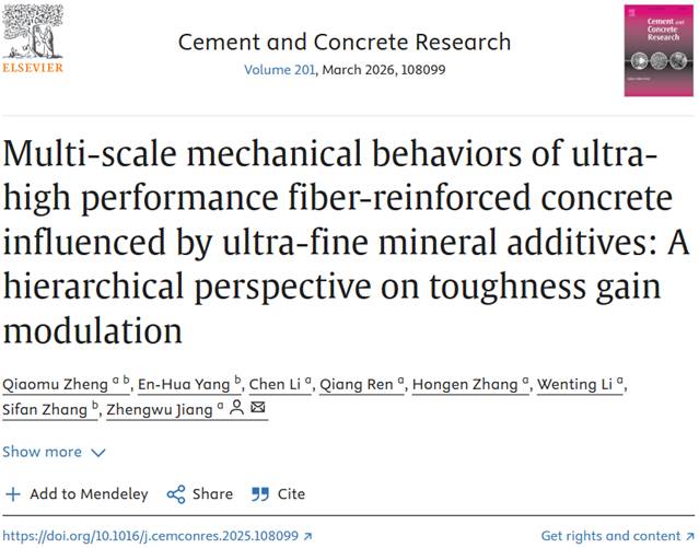 基于构建可定向调控的多尺度韧性增益路径提升水泥基材料宏观力学性能是一项极具前景的材料设计理论。团队聚焦超高性能纤维增强混凝土(UHPFRC)中胶凝体系的多尺度结构特征,通过引入纳米硅灰(USF)和超细粉煤灰(UFFA)两类超细矿物掺料,建立了基于“纳米水化产物结构–微观界面特性–宏观材料力学”耦合调控的高韧UHPFRC多尺度优化技术。研究成果以“Multi-scale mechanical behaviors of ultra-high performance fiber-reinforced concrete influenced by ultra-fine mineral additives: A hierarchical perspective on toughness gain modulation”为题发表在《水泥混凝土研究》(Cement and Concrete Research)。第一作者为郑乔木博士,通讯作者为蒋正武教授。