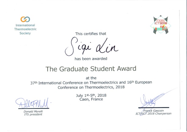 2019届直博研究生林思琪也将自己青春献给了科研,做人之不愿做,行人之不敢行,立足基础,终于厚积薄发。林思琪在实验室从小事做起,也坚信所有科学问题都源于最简的开始。她搜集了现有报道的所有热电材料的热导率及声子结构的信息,并发现低声速、低声学截止频率等有效实现低晶格热导率的指导思路,以此开发了晶格热导率低如木头的硫银锗矿材料。五年的博士生涯,她发表SCI论文31篇热电论文,第一/通讯作者论文7篇,其中包括Cell姊妹刊和Nature子刊2篇。鉴于在热电研究的成果和贡献,被国际热电学会授予2018 ITS Graduate Student(每年遴选2名博士生)和ICT Best Poster等国际荣誉奖项。而今,博士毕业的她选择了在必一运动继续自己的科研生涯。