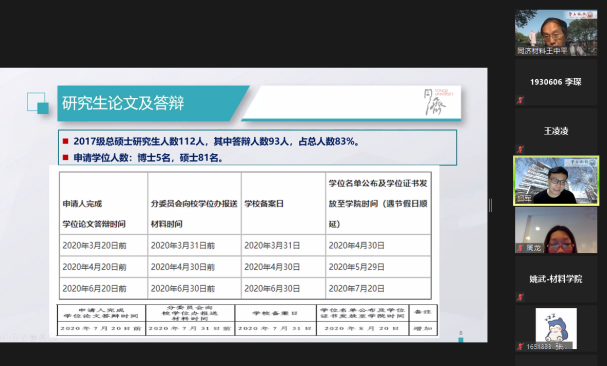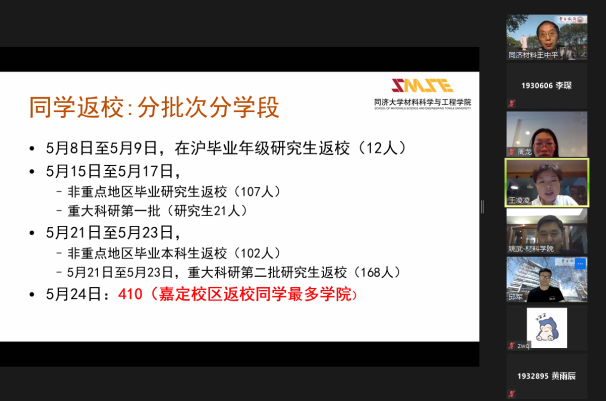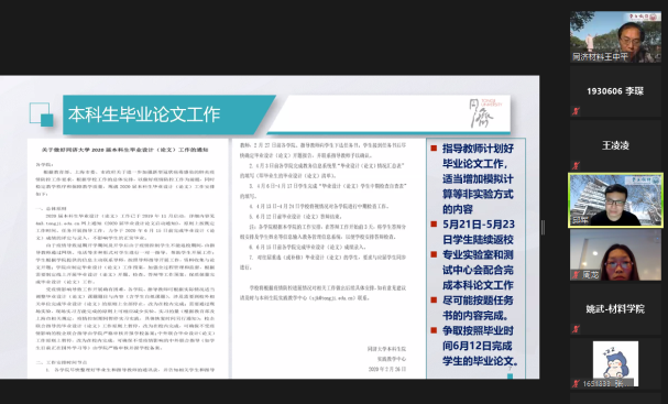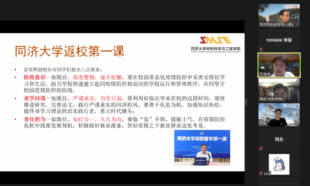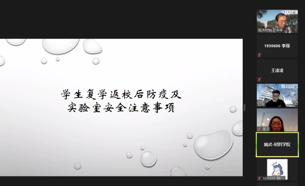 5月24日晚19时30分,在三个批次共三百余位本研同学顺利复学返校后,为保障师生校园健康平安,严格规范学校学院相关规定,必一·运动(b-sports)组织返校学子在线上开展了学院复学第一课,学院党委书记王中平、党委副书记王凌凌、副院长邱军和姚武出席,分别为同学们讲述了防疫期间的日常管理、毕业进展安排以及实验室安全等具体要求。学院320余位本研返校学子在线聆听。